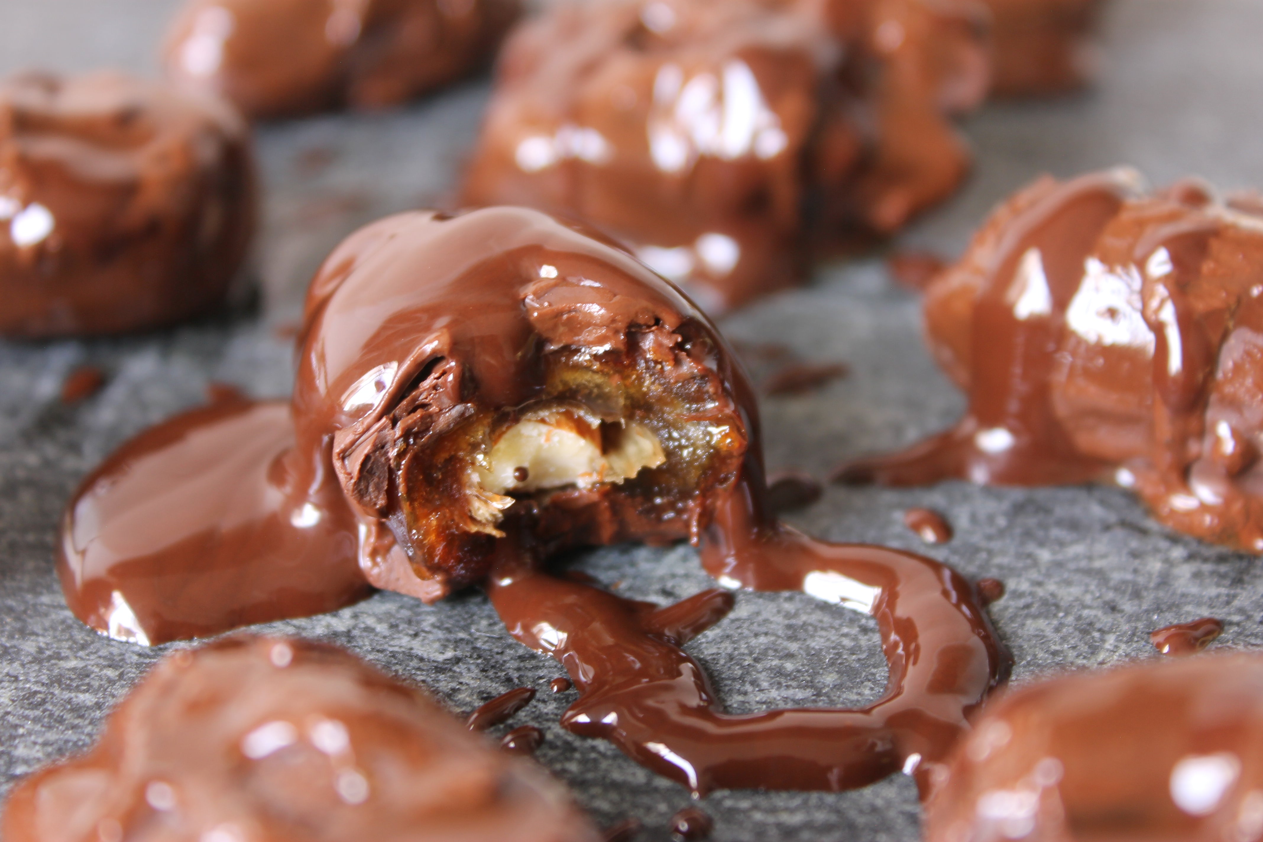 Dátil relleno de almendra cubierto con chocolate semiamargo con Melena de Leon.